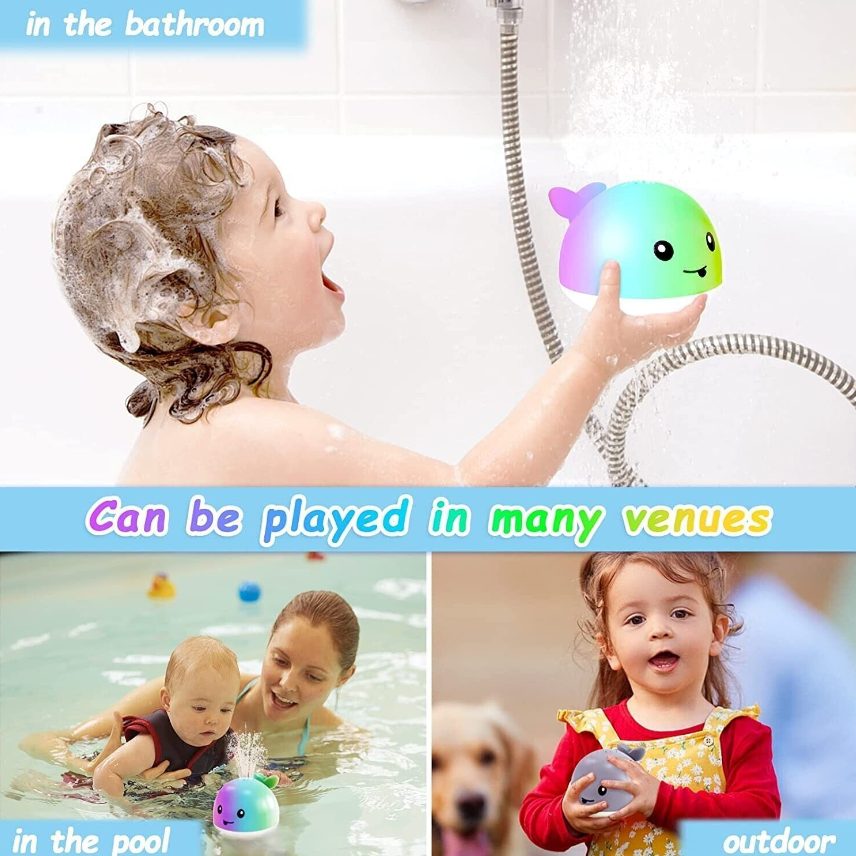 Fun Baby Bath Toy --Cute whale light up baby bath toy can automatically induction spray water and flash colourful lights when you put tub toys in the water. Bath toys, spinning and floating on the water, spray water, bringing endless entertainment for baby bath, your child will enjoy every bath time.Perfect bath toys for toddlers, kids, baby.
