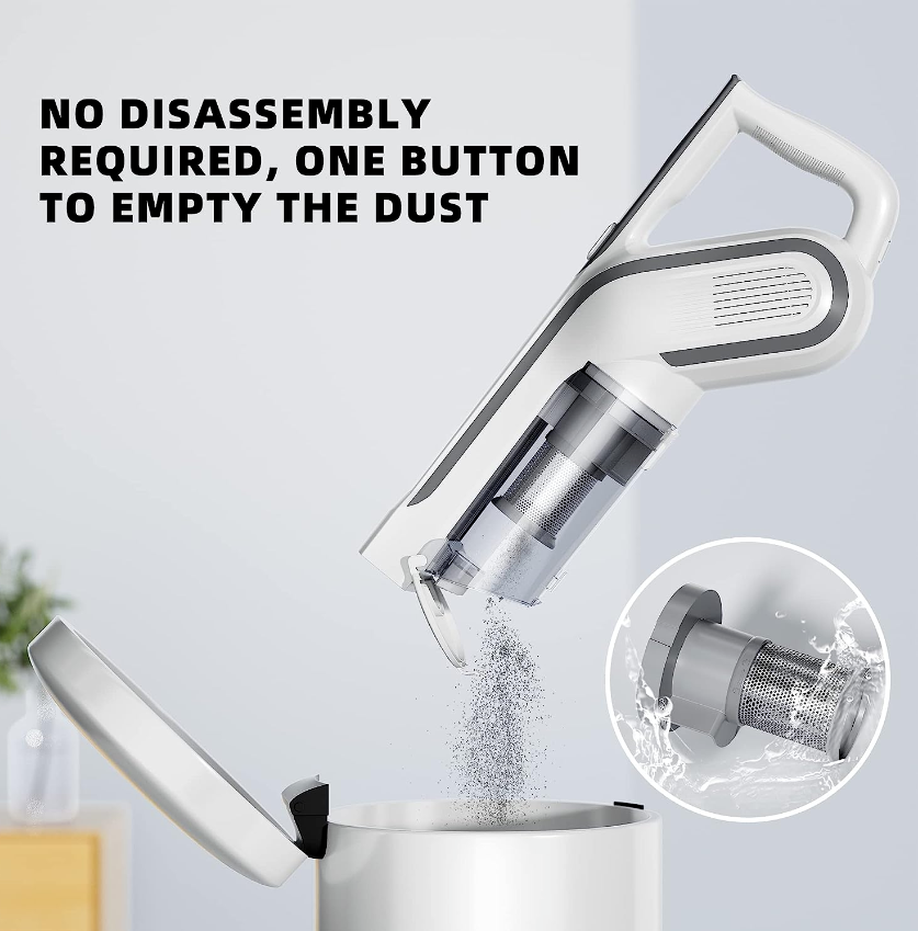 • [Easy Empty Dust Container]: -No bags are required and uses washable HEPA filters. Opens at the bottom with the press of a button, so cleaning up after cleanup is quick and mess-free.