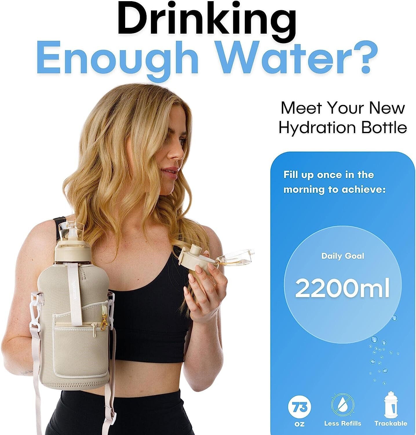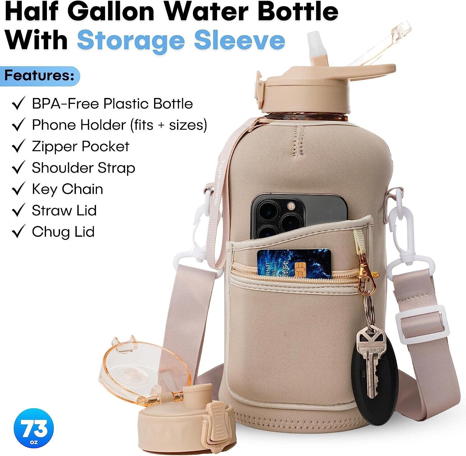 Half Gallon Water Bottle with Storage Sleeve and Straw Lid - 2.2 Liter Large Wat