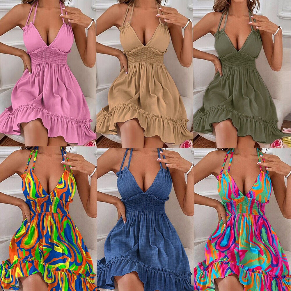 Womens Sexy Backless Swign Dress Summer Deep V-Neck Beach Party Cami Mini Dre